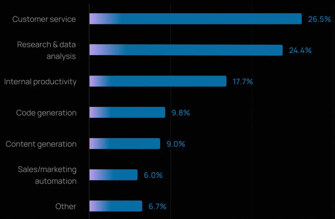 客户服务是最常见的智能体用例(26.5%),紧随其后的是研究与数据分析(24.4%)。这两类应用合计占所有主要部署场景的一半以上。