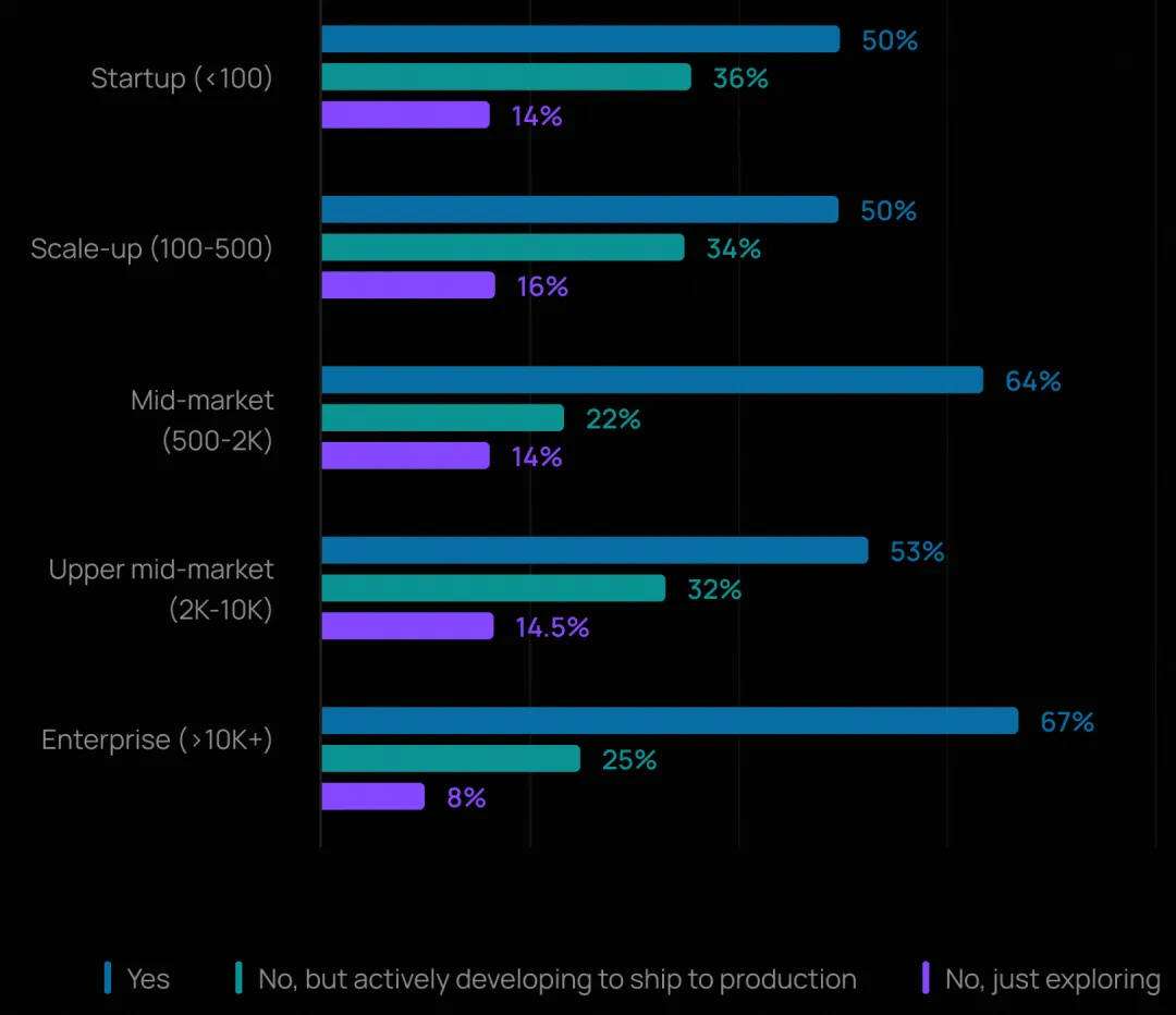 在员工规模超 10,000 人的大型组织中,67% 已部署智能体,24% 正在开发中;而在员工少于 100 人的小型组织中,这一比例分别为 50% 和 36%。这表明大型企业正更快地从试点走向可持续演进,可能得益于其在平台团队、安全性和可靠性基础设施上,有着更大的投入。