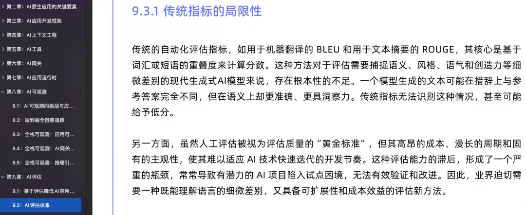 《AI 原生应用架构白皮书》也认为传统的机器学习指标(如 ROUGE、BLEU),存在较高的局限性。