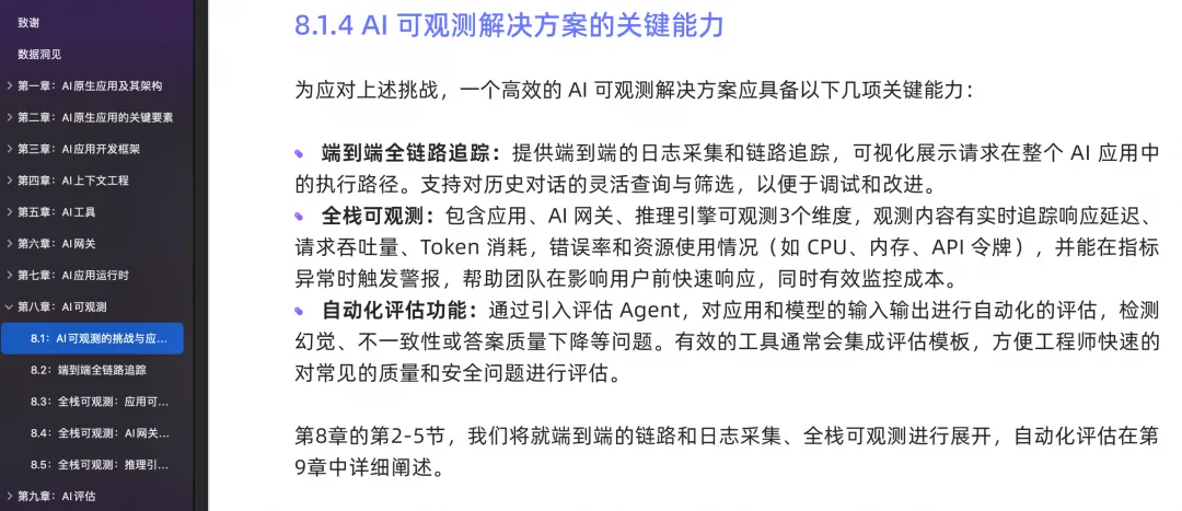 同时,《AI 原生应用架构白皮书》提供了相关的理论和实践。解决以上痛点的关键能力是:端到端的全链路跟踪、全栈观测、自动化评估。