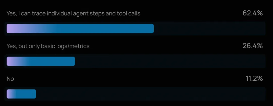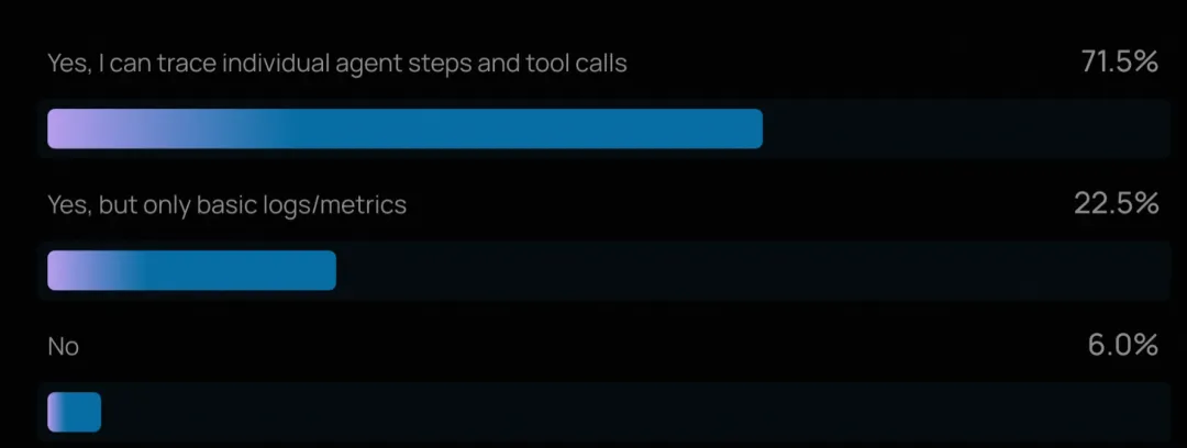 在已上线智能体的团队中,这一比例更高,94% 拥有某种可观测性,71.5%具备完整追踪能力。这揭示了一个基本事实:若无法看清智能体如何推理和行动,团队就无法可靠地调试故障、优化性能,也无法赢得内外部利益相关者的信任。