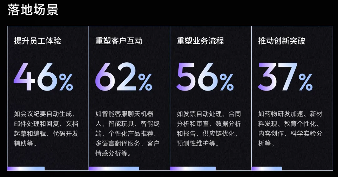 《AI 原生应用架构白皮书》提供了以下4类落地场景供多选,重塑客户互动 > 重塑业务流程 > 提升员工体验 > 推动创新突破。结合两份数据,客户服务和企业内提效是智能体最确定的应用场景。