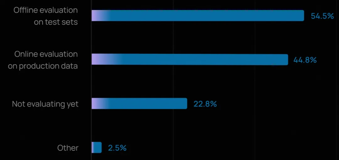 大多数团队仍从离线评估入手(因其门槛较低、设置更清晰),但许多正在叠加多种方法。在开展评估的组织中,近四分之一同时使用离线和在线评估。