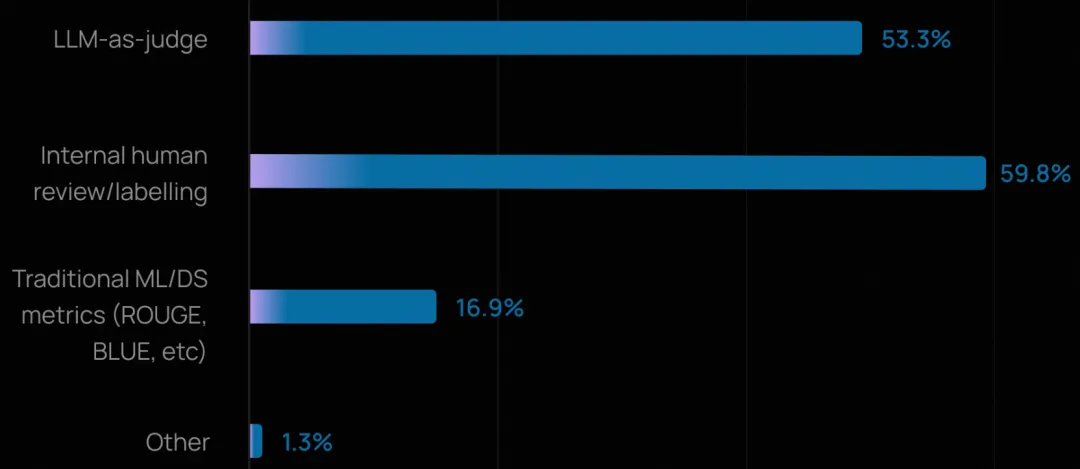 总体而言,人工评审(59.8%)在高风险或需细腻判断的场景中仍不可或缺,而 LLM-as-Judge(53.3%)则被越来越多地用于规模化评估质量、事实准确性和合规性。