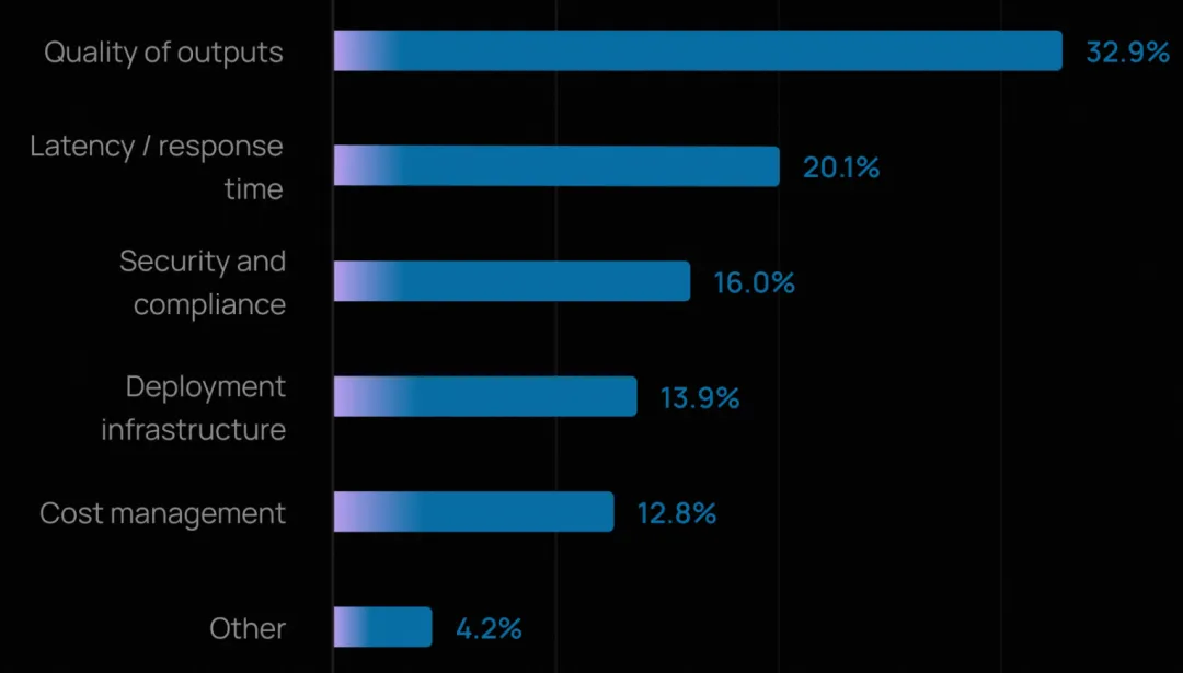 质量仍是头号难题,与去年一致。今年有三分之一的受访者将其列为最大障碍。这里的“质量”涵盖准确性、相关性、一致性,以及智能体能否保持恰当语气并遵守品牌或政策规范。