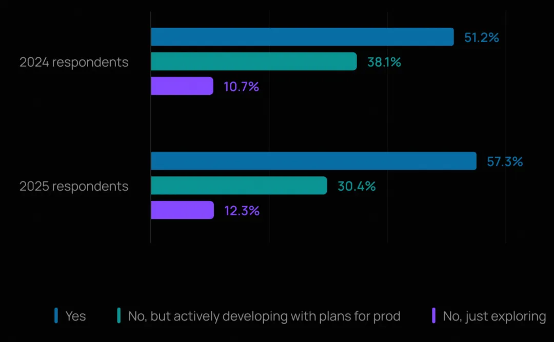 超过半数(57.3%)的受访者表示其公司已在生产环境中运行智能体,另有 30.4% 正在积极开发并有明确的上线计划。