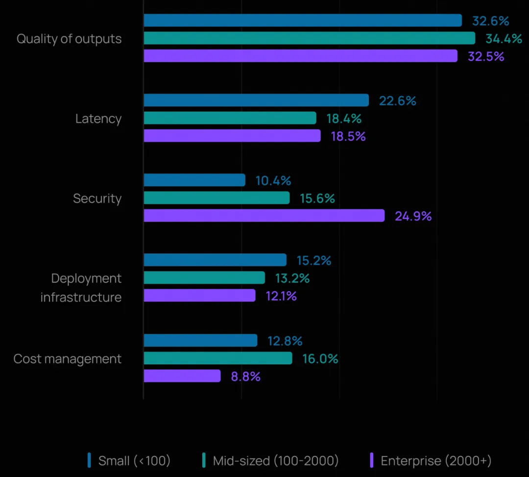 延迟成为第二大挑战(20%)。随着智能体进入客户服务、代码生成等面向客户的场景,响应速度已成为用户体验的关键。这也反映了团队在质量与速度之间的权衡:能力更强、步骤更多的智能体虽能产出更高质量结果,但响应往往更慢。