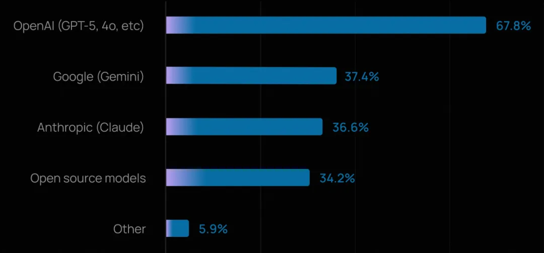 多模型策略成常态:OpenAI 的 GPT 系列模型占据主导,但 Gemini、Claude 和开源模型也获得广泛应用;微调尚未普及。
