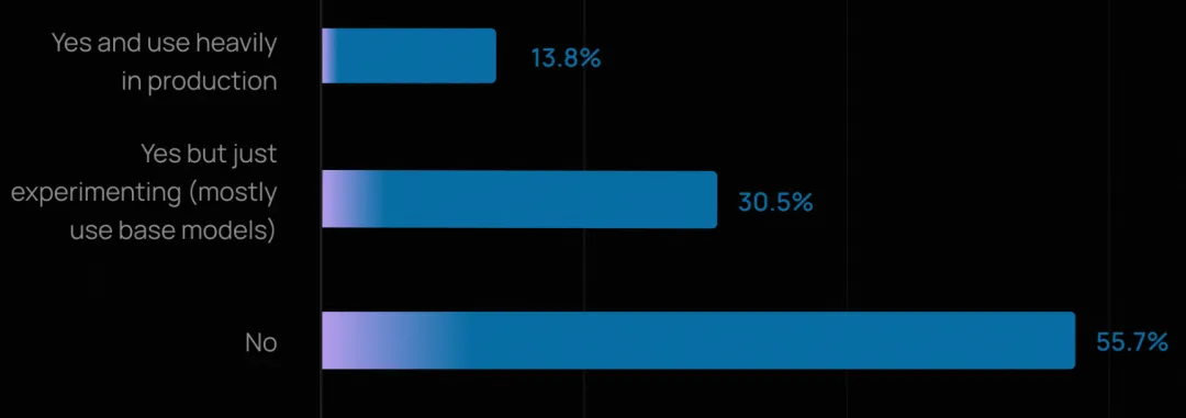 同时,微调仍未普及。57% 的组织未进行任何微调,而是依赖基础模型结合提示工程和检索增强生成。由于微调需要大量投入(数据收集、标注、训练基础设施和持续维护),目前主要用于高影响力或高度专业化的场景。