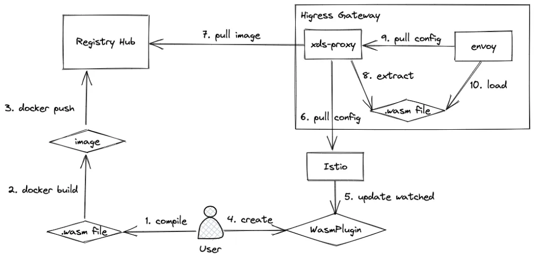 - Higress Gateway 中的 envoy 进程从 xDS proxy 获取到配置,发现 wasm 文件的本地路径
