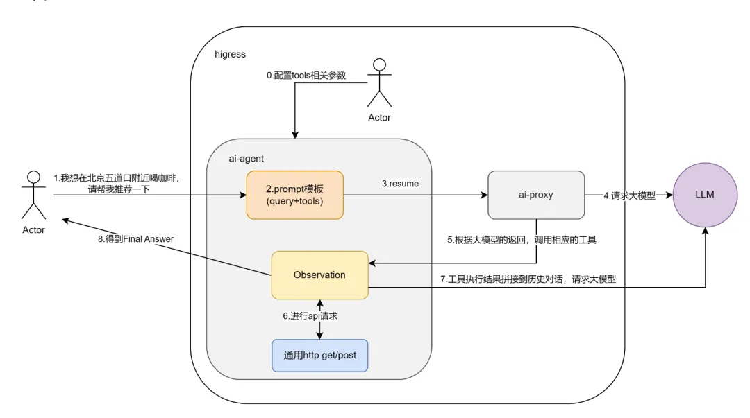 AI Agent 插件基于 Agent ReAct 能力,允许用户实现零代码快速构建 AI Agent 应用。通过简单配置 API 的作用、URL、请求参数等信息,用户即可将大模型与外部服务进行连接,使其具备特定功能,如地图助手或天气助手。AI Agent 让大模型能够根据用户的需求通过 API 接口自动调用合适的工具以完成复杂任务,从而解决大模型在垂直领域知识不足的问题。