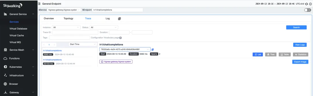 127.0.0.1 skywalking.higress.io浏览器输入 http://skywalking.higress.io:10000 访问 SkyWalking 界面。请求的链路追踪信息如下。