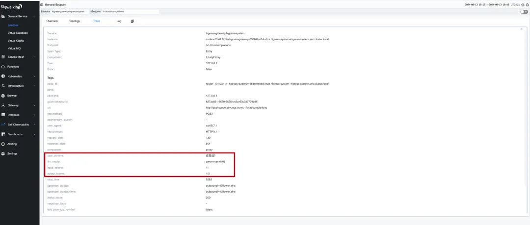 tracing_span: - key: user_content value_source: request_body value: messages.0.content - key: llm_model value_source: request_body value: model发起一个请求,然后查看 SkyWalking 中的链路追踪信息。