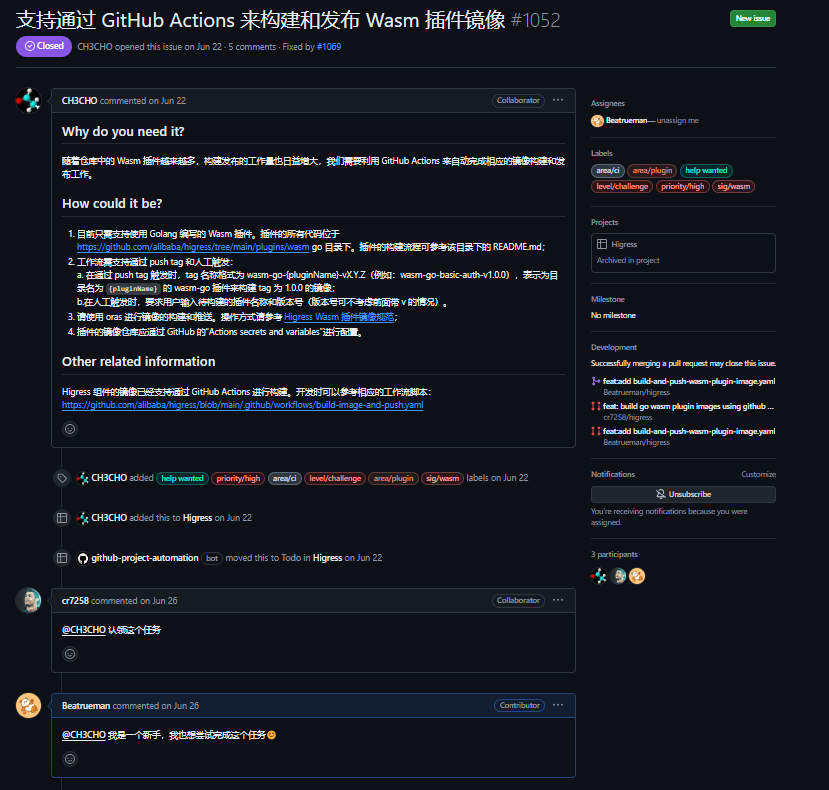因为 Higress 这个开源项目是开放式赛题,浏览了当时的 issues,因为接触过 CI/CD,并且懂得 Kubernetes 和 Docker 的一些操作,所以我最终选择了这个 issue:支持通过 GitHub Actions 来构建和发布 Wasm 插件镜像 · Issue #1052 · alibaba/higress