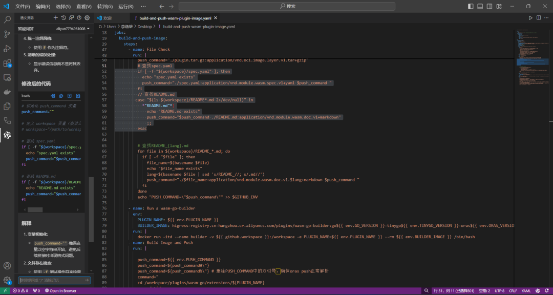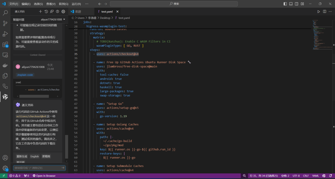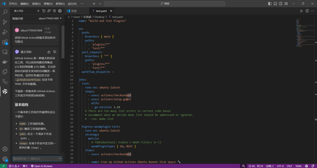 在使用通义灵码的过程中,我先复制了一份写好的 Github Action Workflow,利用通义灵码的解释代码和直接对话功能,我很快地了解了 Github Action 的基本语法以及格式。