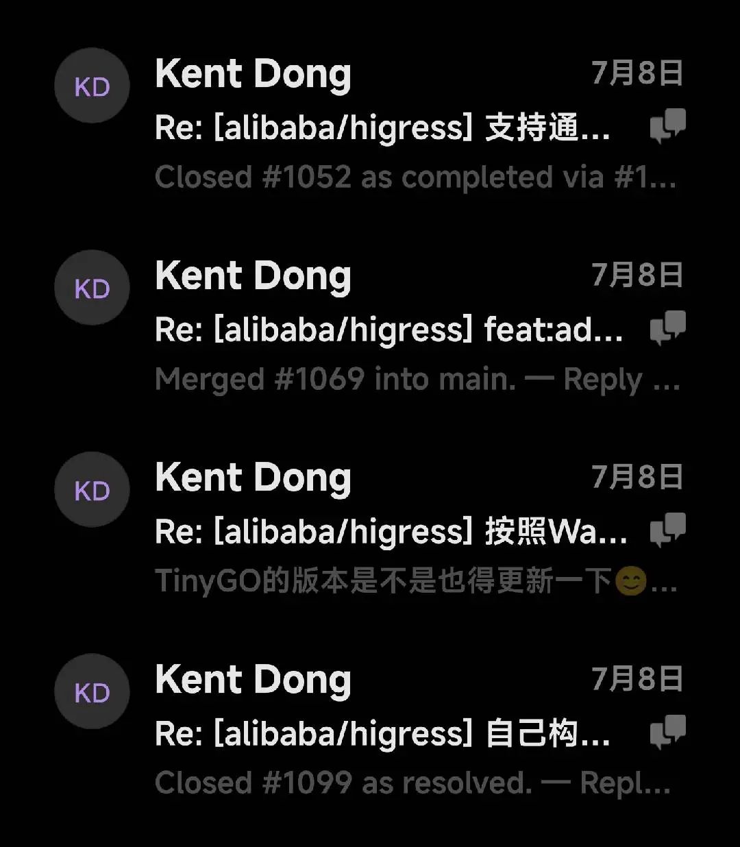 Higress 是一个活跃的开源社区,在这个社区中大家都积极的分享自己的知识和 idea,乐于寻找bug。这种互帮互助,乐于分享的活跃氛围大大激发了我的开源兴趣。