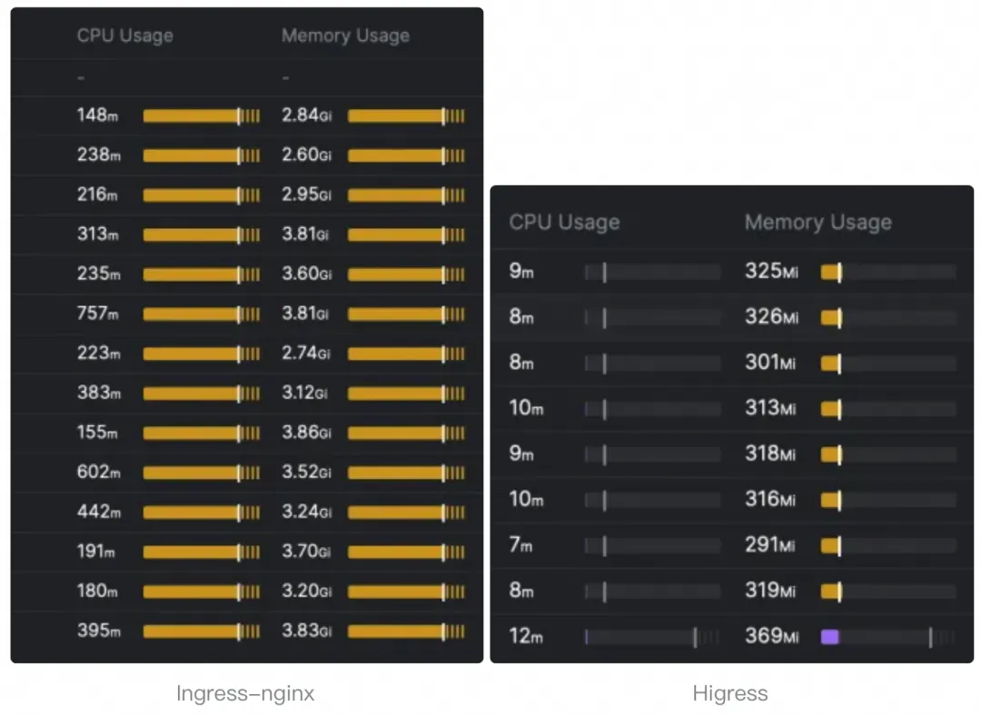下图来自 Higress 的开源用户 Sealos 将网关从 Ingress-nginx 迁移到 Higress 之后的资源用量对比,内存使用下降到了十分之一: