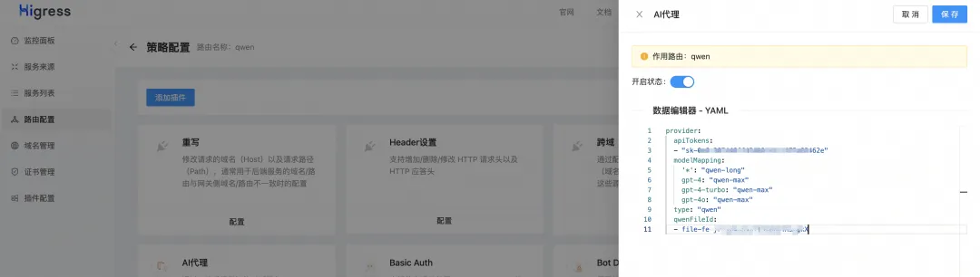 response: enable: true prompt: "帮我修改以下HTTP应答信息,要求:1. content-type修改为application/json;2. body由xml转化为json;3.移除content-length。"provider: serviceName: qwen domain: dashscope.aliyuncs.com apiKey: sk-xxxxxxxxxxxxxxxxxxx请求响应示例: