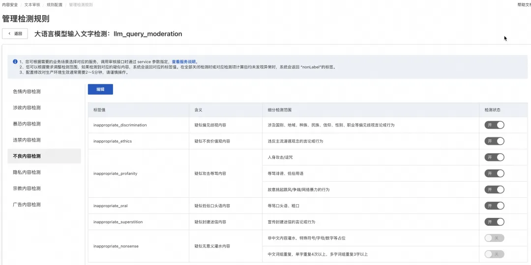 - AI 内容审核插件:支持对接阿里云内容安全云服务,可以拦截有害语言、误导信息、歧视性言论、违法违规等内容。