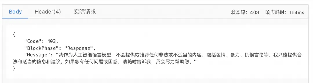 配置后,如果请求/响应中包含了非法内容,被内容安全拦截后,网关会返回内容安全建议的回答: