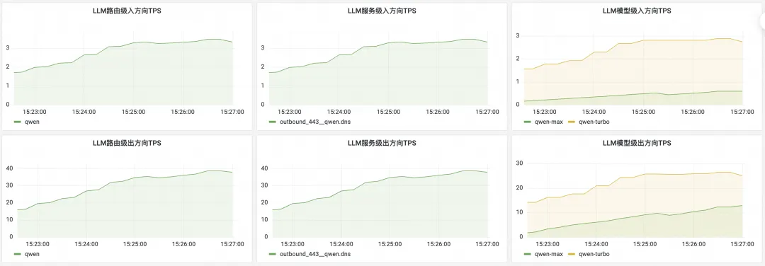 相比于传统微服务,LLM 应用中主要通过 token 来衡量流量大小,针对此特点,我们构建了路由级、服务级、模型级的 token 用量观测能力,包括日志、监控以及告警,AI统计插件提供了构建AI可观测系统的基础能力。