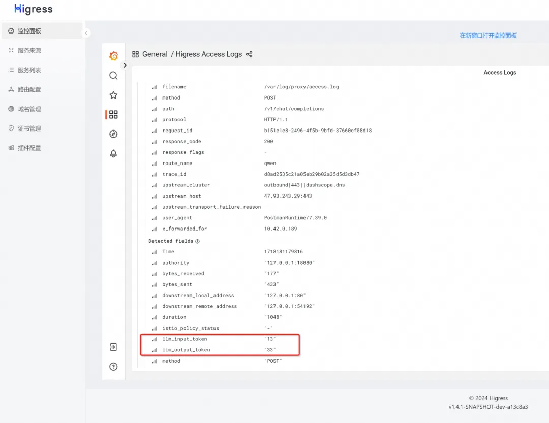 helm repo add higress https://higress.cn/helm-charts# 安装helm install higress higress/higress --set global.o11y.enabled=true -n higress-system --create-namespace# 升级helm upgrade higress higress/higress --set global.o11y.enabled=true --reuse-values -n higress-system --create-namespace开启后即可在 Higress 控制台上看到访问日志,并可以使用 Loki 进行日志分析: