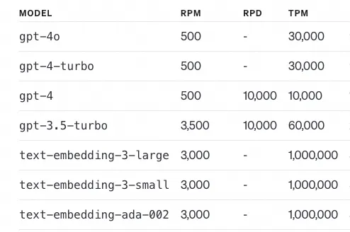 如下图是 OpenAI 对于不同模型在 Tier 2 这个级别的调用方的限制,大部分 AI 产品也都有类似的限制: