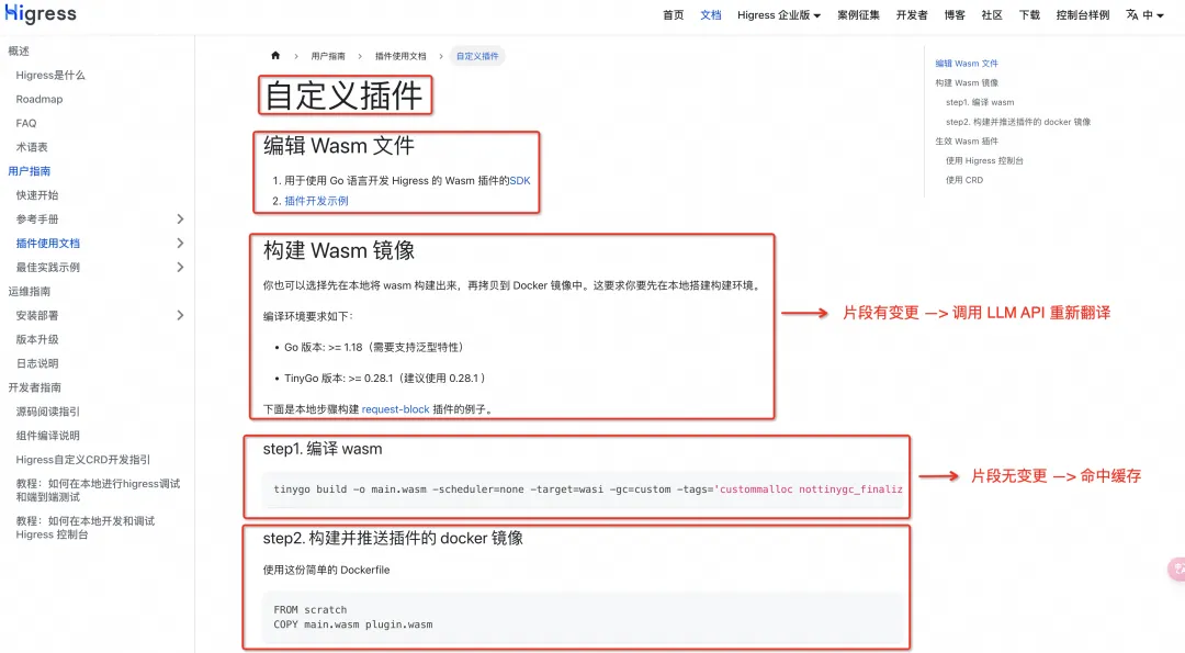 该插件实现了将 LLM 响应进行抽取并缓存的功能,对于向 LLM API 高频请求相同问题的场景可以显著降低响应时延并节省成本。我们之前用Higress + 通义千问进行技术内容翻译,可以看到 LLM 的翻译能力是很强的,Higress 官网的英文文档,也将基于 LLM 进行翻译。因为文档需要持续更新迭代,我们使用 Github Action 实现自动化的 CICD。结合这个 AI 缓存插件 + 文档分片翻译(如下图所示),就可以实现低成本且高效的文档自动化翻译流程。
