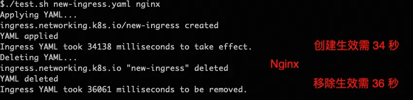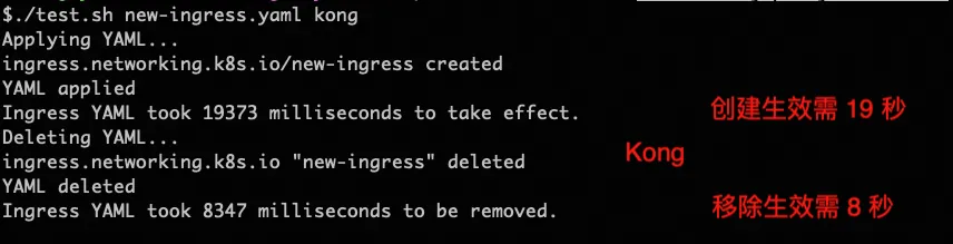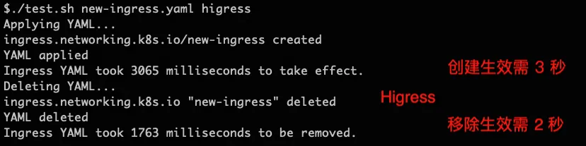 下面是和同类网关(均为最新版本)的一组对比测试,在有 10000 个 Ingress 的情况下,新增一个 Ingress 后,请求网关验证创建路由的生效时间(判断 200 状态码);接着再删除该 Ingress, 请求网关验证移除路由的生效时间(判断 404 状态码),Higress 的优势显著:
