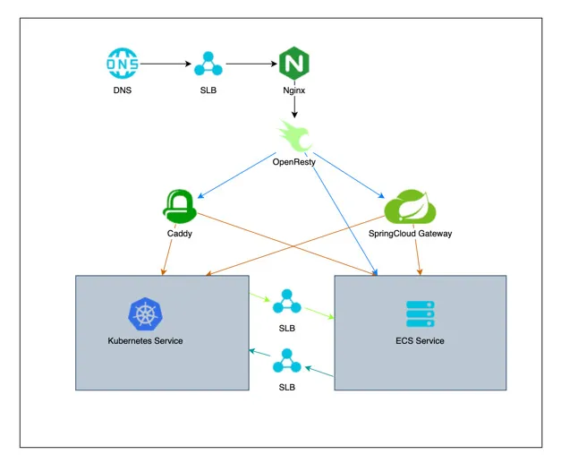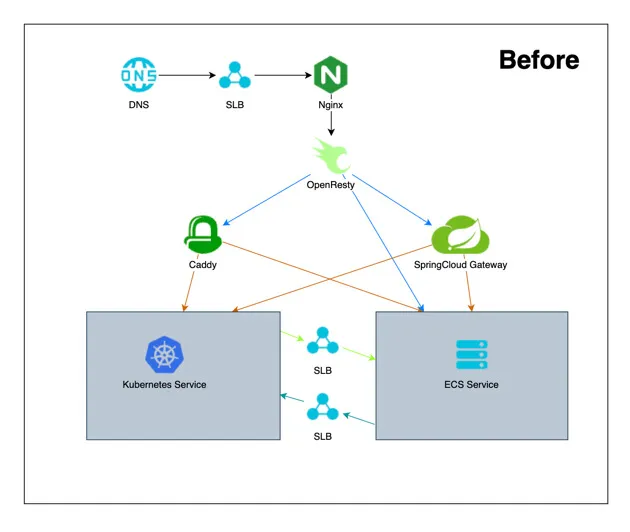 - 历史架构使用多个流量转发中间件导致流量路径冗长、复杂且故障排查困难(LB + OpenResty + Nginx + Caddy + SpringCloud-Gateway);