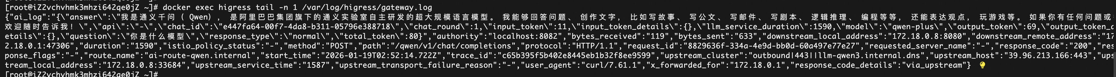 确认日志输出成功,Docker 部署的 higress 会在 /var/log/higress/gateway.log,在宿主通过 docker exec higress tail -n 10 /var/log/higress/gateway.log 可直接查看日志输出