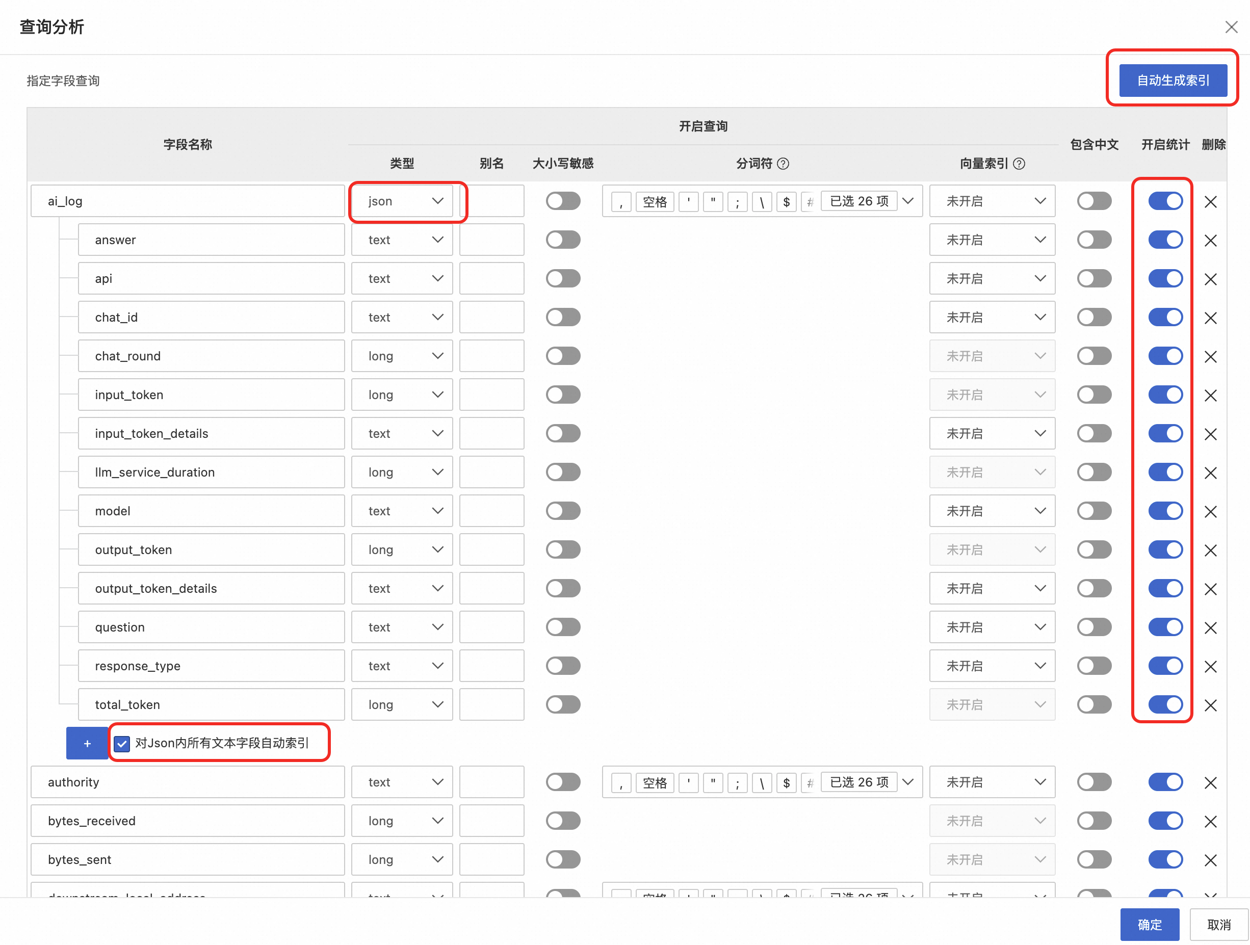 - 所有字段,包括 ai_log 的属性字段全部配置开启统计,否则会影响后续的可观测